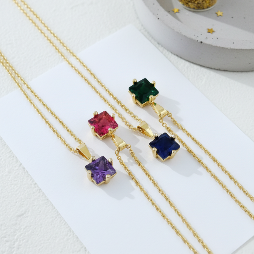 Minimal kare formda tasarlanan bu zarif kolye, yan yana gelen iki doğum taşıyla anlamını senin için buluyor.