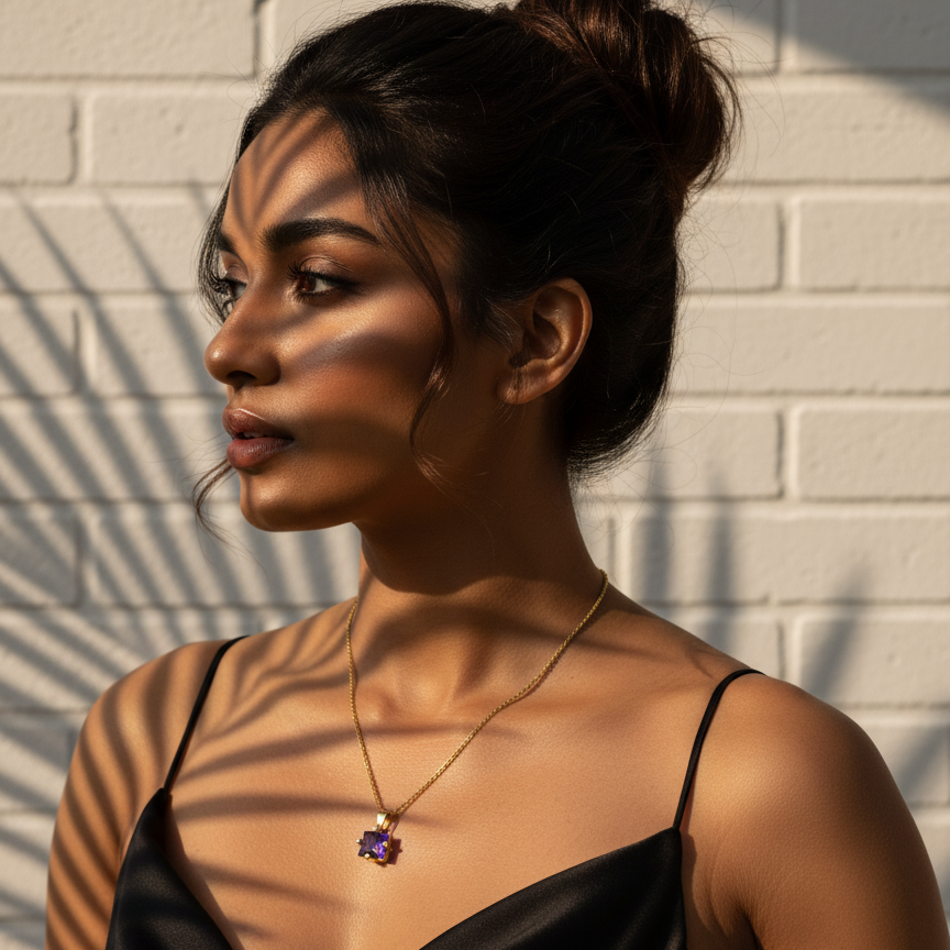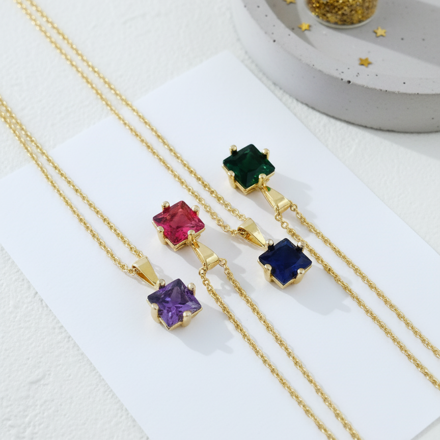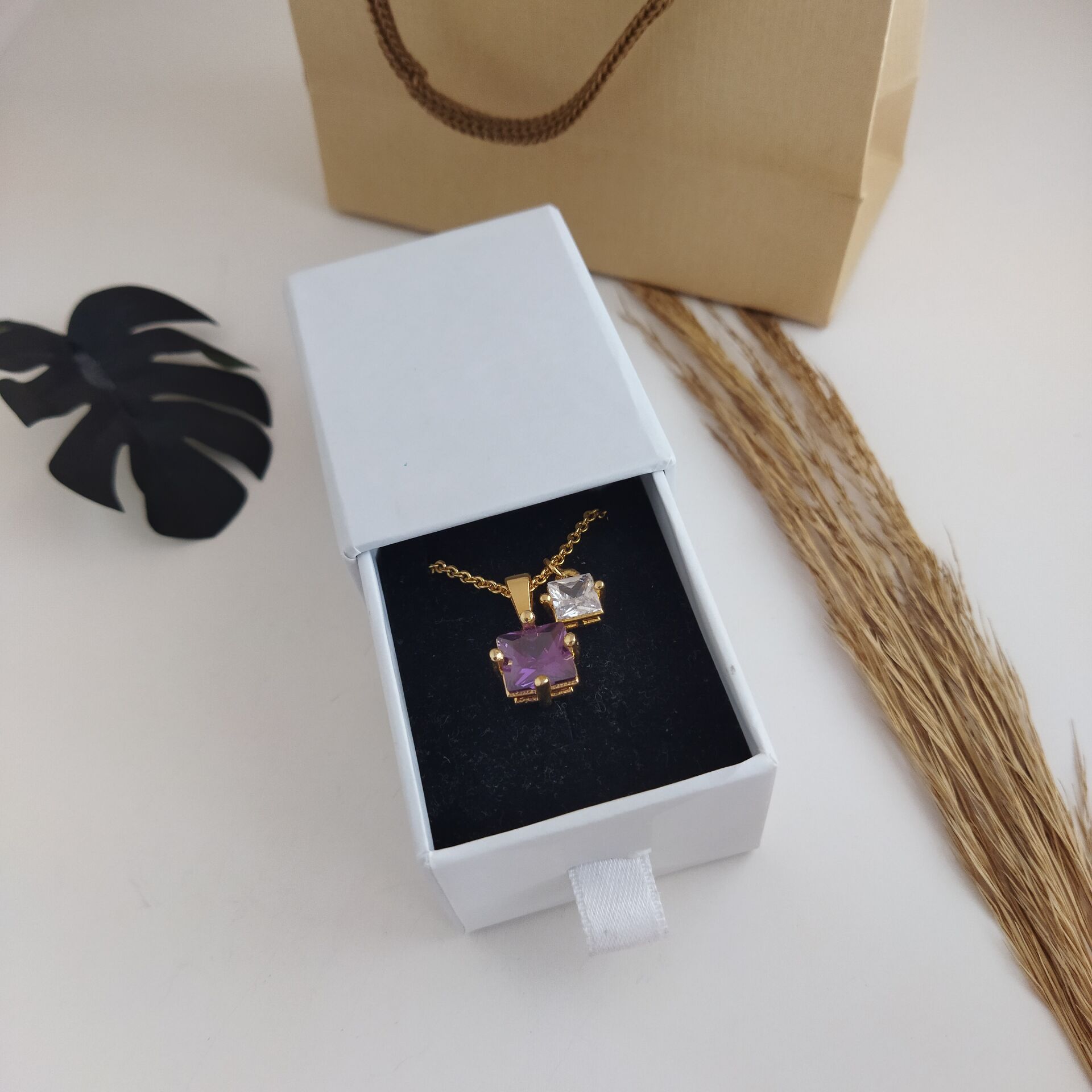 Minimal kare formda tasarlanan bu zarif kolye, yan yana gelen iki doğum taşıyla anlamını senin için buluyor.
