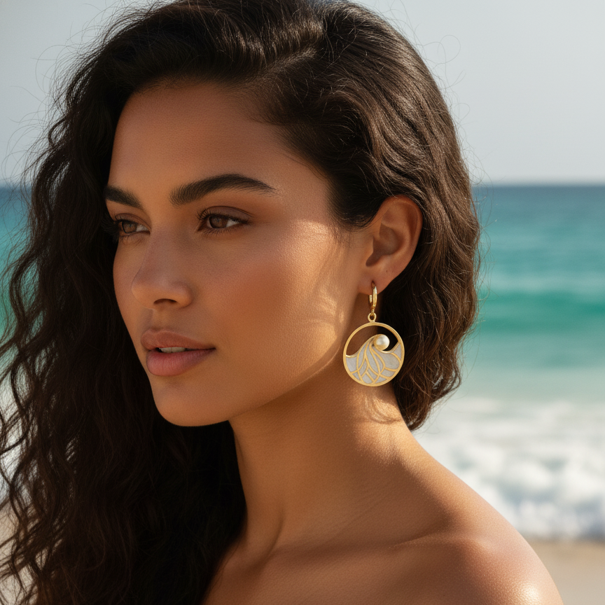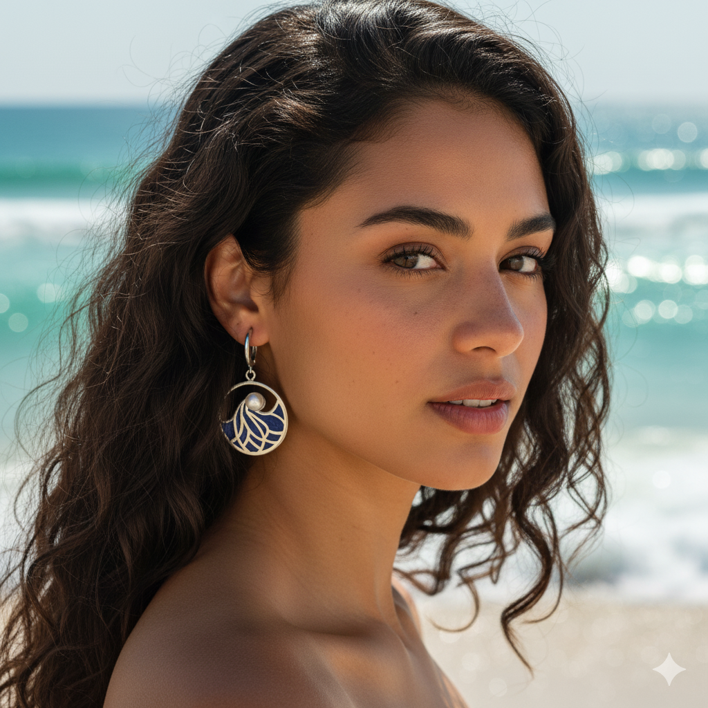Denizin ritminden ilham alan bu el yapımı küpeler, her hareketinde dans eden yüzen bir inci ile dönen bir okyanus dalgasına sahiptir. El işçiliği Lazer Mine ile yapılan bu işlem küpe üzerindeki deniz dalgası desenine hayat verir. Deniz ve Okyanus severler için hem takılabilir,hem hediye olarak verilebilecek bir tasarım üründür.